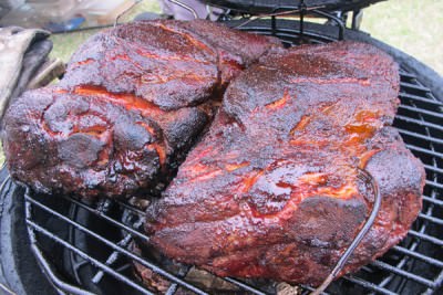 Place pork butt in cooker fat cap down (assuming your heat is coming from below), and cook at 240°F for 8-9 hours, or until the exterior has a rich brown crust, and the temperature in the center of the butt is approximately 170-175°F. The smells coming off will be absolutely unbelievable…the rich brown Dizzy Pig crust, the succulent fatty pork.